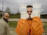 man beachte den orangen Pullover